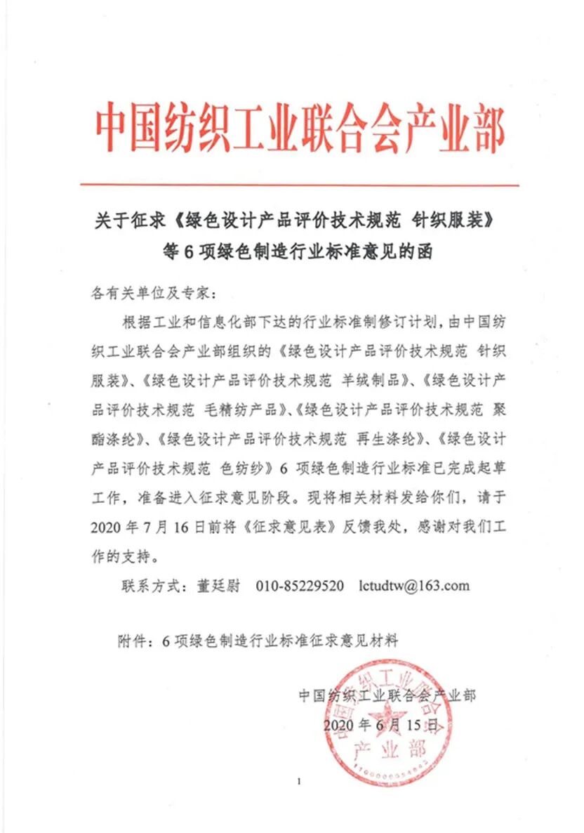 日前,根据工业和信息化部下达的行业标准制修订计划,由中国纺织工业联合会产业部组织的《绿色设计产品评价技术规范 针织服装》、《绿色设计产品评价技术规范 羊绒制品》、《绿色设计产品评价技术规范 毛精纺产品》、《绿色设计产品评价技术规范 聚酯涤纶》、《绿色设计产品评价技术规范 再生涤纶》、《绿色设计产品评价技术规范 色纺纱》6项绿色制造行业标准完成起草工作,准备进入征求意见阶段。中纺联发布相关公告,具体信息如下: