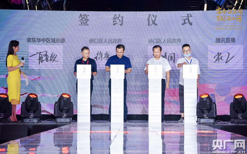 开幕式上,武汉市硚口区政府分别与京东、腾讯直播、杭州小时光电子商务有限公司等签订合作协议。
