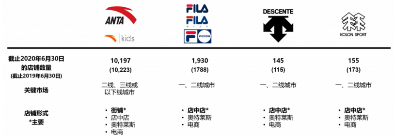 截至2020年6月30日,于中国大陆及海外国家之安踏店(包括安踏儿童独立店)的数目共有10197家(2019年底:10516家),于中国大陆、香港、澳门和新加坡之FILA店数目共有1930家(2019年底:1951家),而于中国大陆之DESCENTE店数目共有145家(2019年底:136家),于中国大陆和香港之KOLON SPORT店数目共有155家(2019年底:185家)。