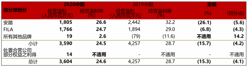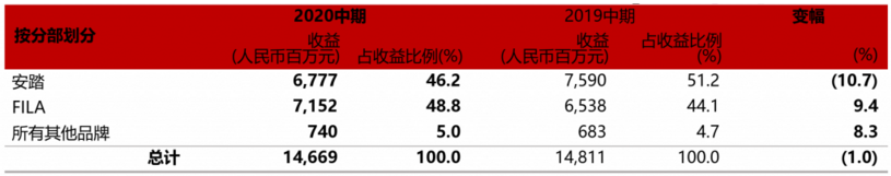 今年上半年FILA收入首次超过安踏,占收入比例达到48.8%: