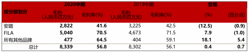 集团整体毛利率为56.8%,创历史新高,并领先主要竞争对手,较去年同期增0.7个百分点,上升主要由FILA品牌贡献。受疫情影响,股东应占溢利(不计合营公司亏损)为人民币23.77亿元,同比跌20.1%。