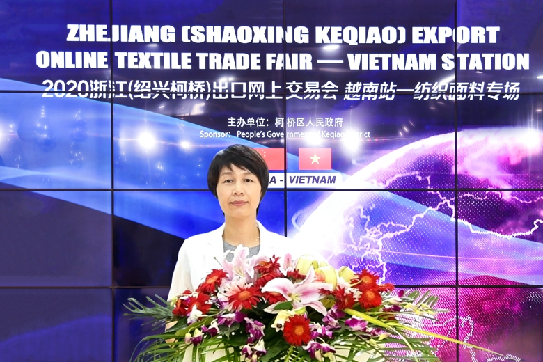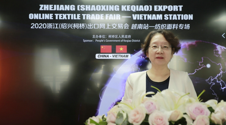 绍兴市柯桥区人民政府副区长方优美在开幕致辞中介绍道,2019年柯桥地区生产总值1504亿元,人均3.2万美元,规上工业产值2045亿元,综合实力位居全国百强区第11位。今年以来,柯桥努力克服新冠疫情影响,坚持推进复工复产,特别是实施“丝路柯桥·直播全球”系列活动,开展各类云展会、云发布、云对接,加快恢复经贸往来,稳住了工业贸易基本盘。她还表示,借着“一带一路”战略深入实施和中越经贸关系不断升温,柯桥与越南各地在纺织贸易领域往来更频繁,合作更紧密。特别是2018年以来,越南市场成为柯桥纺织贸易最大的出口地,2018、2019年,柯桥对越南出口分别为48.7亿、53.8亿人民币,同比分别增长17.4%、10.4%,出口权重分别为6.5%、6.2%。“我们非常看好中越经贸越来越热这一大环境,相信我们合作的舞台会越来越大,前景将越来越明。”