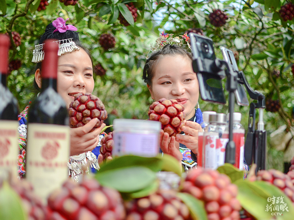 △贵州锦屏县电商直播带货现场。这是当地特色水果,苗语叫“布福娜”。