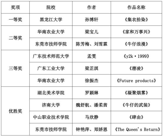 中国服装设计最高荣誉奖“金顶奖”获得者、广东省服装设计师协会副会长李小燕、中国著 名时装设计师、粤港澳大湾区时尚设计师大联盟协会筹委会主席何建华、中国十佳服装设计师、中国针织工业协会针织时装设计顾问黄刚组成,经激烈角逐,最终来自黑龙江大学孙博轩设计的作品《集衣拾染》摘得大赛桂冠。具体获奖名单如下:
