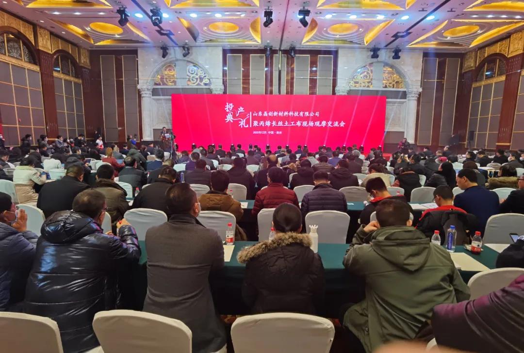 12月16日上午,山东晶创新材料科技有限公司投产典礼暨聚丙烯长丝土工布现场观摩交流会召开,举行了投产典礼仪式并对纺粘针刺生产线技术创新、聚丙烯长丝纺粘针刺土工布等技术和产品进行了推介。