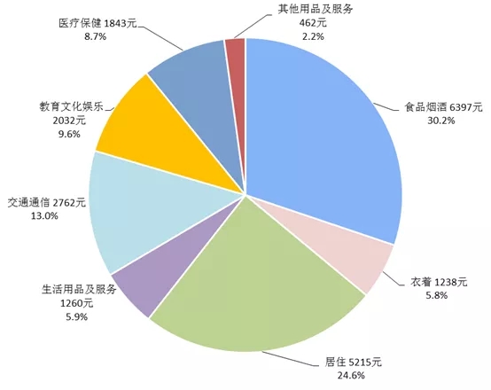 2020年,全国居民人均食品烟酒消费支出6397元,增长5.1%,占人均消费支出的比重为30.2%;人均衣着消费支出1238元,下降7.5%,占人均消费支出的比重为5.8%;人均居住消费支出5215元,增长3.2%,占人均消费支出的比重为24.6%;人均生活用品及服务消费支出1260元,下降1.7%,占人均消费支出的比重为5.9%;人均交通通信消费支出2762元,下降3.5%,占人均消费支出的比重为13.0%;人均教育文化娱乐消费支出2032元,下降19.1%,占人均消费支出的比重为9.6%;人均医疗保健消费支出1843元,下降3.1%,占人均消费支出的比重为8.7%;人均其他用品及服务消费支出462元,下降11.8%,占人均消费支出的比重为2.2%。