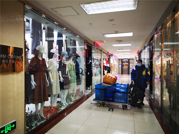 在百荣世贸商城里,时不时就能看到快递员拉着小车正在收件。