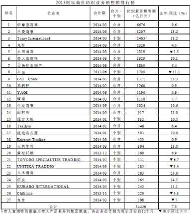 纤研新闻社进行的业绩问卷调查显示,2013财年27家调查对象企业的合计销售额为3兆4429亿日元,同比增长了7.3%。与只有0.1%增幅的2012财年(28家企业合计)相比,有了大幅的提高。收益减少的只有6家,与2012财年的14家相比也大为减少。据估计,与迅销公司关联业务较多的企业,订单数量的增加带来的增收较多,其他企业的增收则主要受益于日元贬值。在纺织业务销售额排行榜中未公布的企业中,三井物产的纺织相关业务销售额达2000亿日元,双日公司的纺织业务部销售额约有1000亿日元。