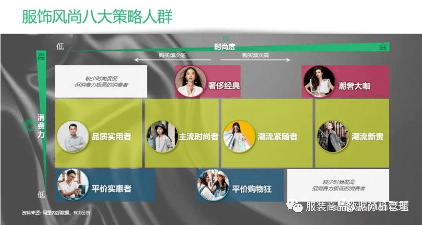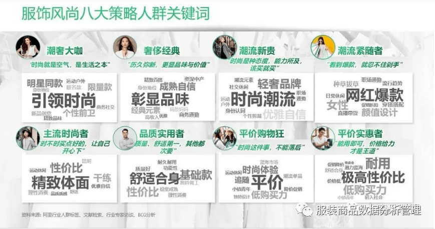 根据各个城市消费力和时尚度,暂且将服饰消费者分为了特征鲜明的八大人群: 潮奢大咖、奢侈经典、潮流新贵、潮流紧随者、主流时尚者、品质实用者、平价购物狂和平价实惠者。