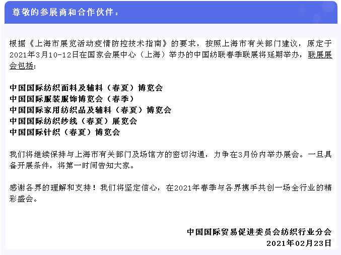 重要通知!2021年中国纺联春季联展将延期举办