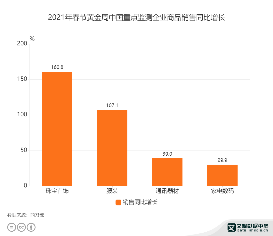 从2021年春节黄金周中国重点检测企业商品销售同比增长数据显示,珠宝首饰行业重点监测企业销售同比增长160.8%;服装行业重点监测企业销售同比增长107.1%;通讯器材、家电数码行业检测企业销售同比增长也较大,分别为39%和29.9%。