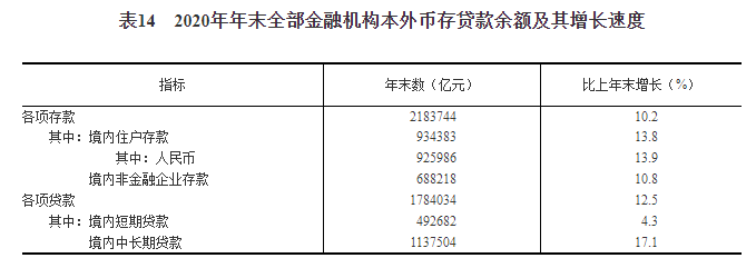 全年社会融资规模增量[40]34.9万亿元,按可比口径计算,比上年多9.2万亿元;年末社会融资规模存量[41]284.8万亿元,按可比口径计算,比上年末增长13.3%,其中对实体经济发放的人民币贷款余额171.6万亿元,增长13.2%。年末全部金融机构本外币各项存款余额218.4万亿元,比年初增加20.2万亿元,其中人民币各项存款余额212.6万亿元,增加19.6万亿元。全部金融机构本外币各项贷款余额178.4万亿元,增加19.8万亿元,其中人民币各项贷款余额172.7万亿元,增加19.6万亿元。人民币普惠金融贷款[42]余额21.5万亿元,增加4.2万亿元。