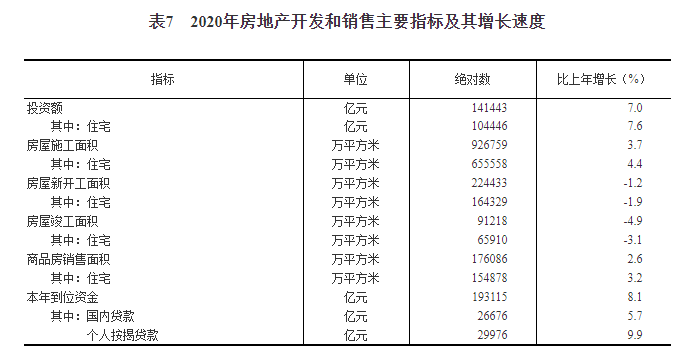全年房地产开发投资141443亿元,比上年增长7.0%。其中住宅投资104446亿元,增长7.6%;办公楼投资6494亿元,增长5.4%;商业营业用房投资13076亿元,下降1.1%。年末商品房待售面积49850万平方米,比上年末增加29万平方米。其中,商品住宅待售面积22379万平方米,减少94万平方米。