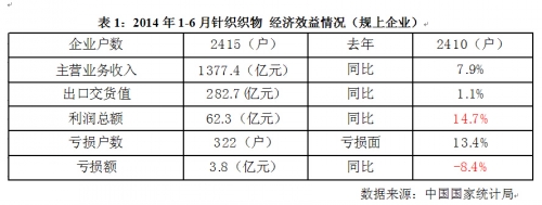 表1:2014年1~6月针织织物 经济效益情况(规模以上企业)