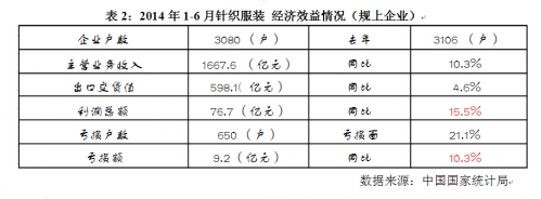 表2:2014年1~6月针织服装 经济效益情况(规模以上企业)