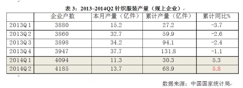 表3:2013~2014Q2针织服装产量(规模以上企业)