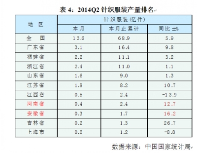 表4:2014Q2针织服装产量排名