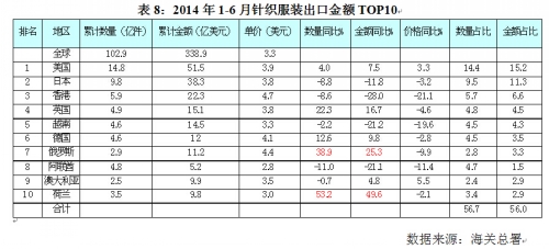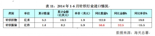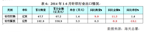 表6:2014年1~6月针织行业出口情况