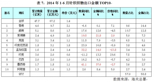 表7:2014年1~6月针织织物出口金额TOP10