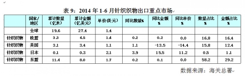 表9:2014年1~6月针织织物出口重点市场