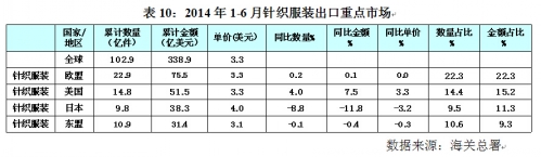 表10:2014年1~6月针织服装出口重点市场