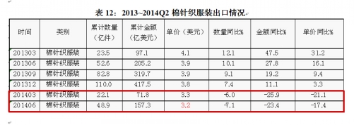 表12:2013~2014Q2棉针织服装出口情况