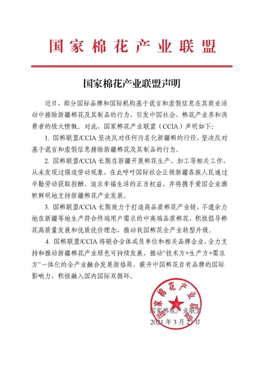 国家棉花产业联盟声明指出,坚决反对任何污名化新疆棉花的行径,坚决反对某些国际品牌、机构基于谎言和虚假信息在其供应链和日常业务中排除新疆棉花及其制品的行为;联盟咯呼吁国际社会正视新疆各族人民辛勤劳动获取报酬、追求幸福生活的正当权益,并将携手爱国企业旗帜鲜明地支持新疆棉花产业发展;联盟致力于打造高品质棉花产业链,不遗余力地在新疆等地生产符合终端需求的中高端品质棉花,积极倡导棉花高质量发展和优质优价理念,致力于推动我国棉花全产业转型升级;联盟将联合全体成员单位和相关品牌企业,推动“技术方+生产方+需求方”一体化的全产业融合新格局,提升中国自有品牌的国际影响力,积极融入国内国际双循环。