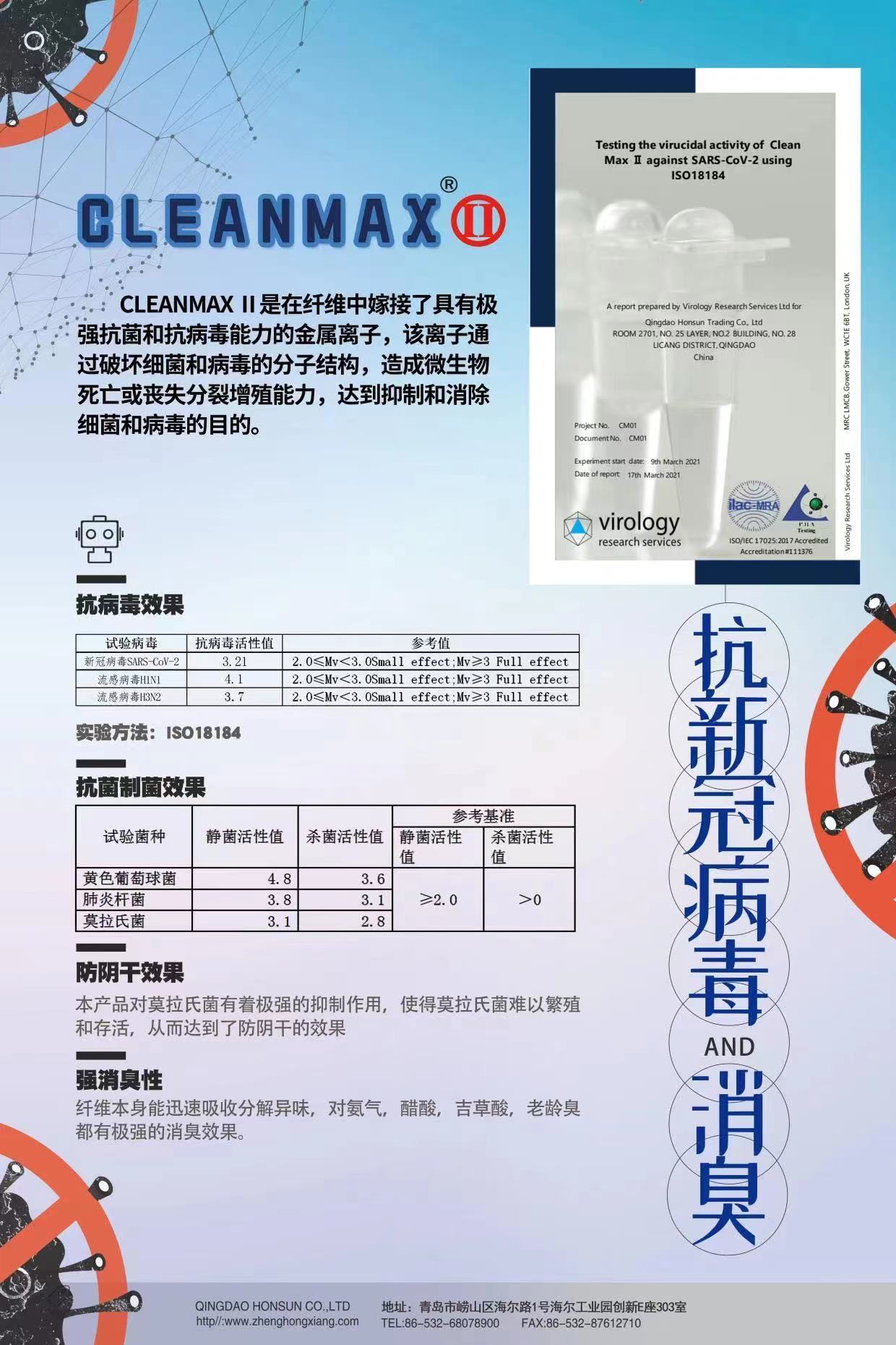经过一年多的深入研发,青岛正鸿祥贸易有限公司通过将棉花进行接枝改性处理,成功推出CLEAN MAX II新材料,成为国内首创并获得VRS认证的抗新冠病毒、消臭纤维。