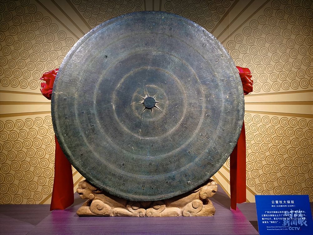 △陈列在广西民族博物馆的“铜鼓王”——云雷纹大铜鼓,面径165厘米,重299公斤,是迄今发现世界上最大的古代铜鼓。(总台央广记者潘毅拍摄)