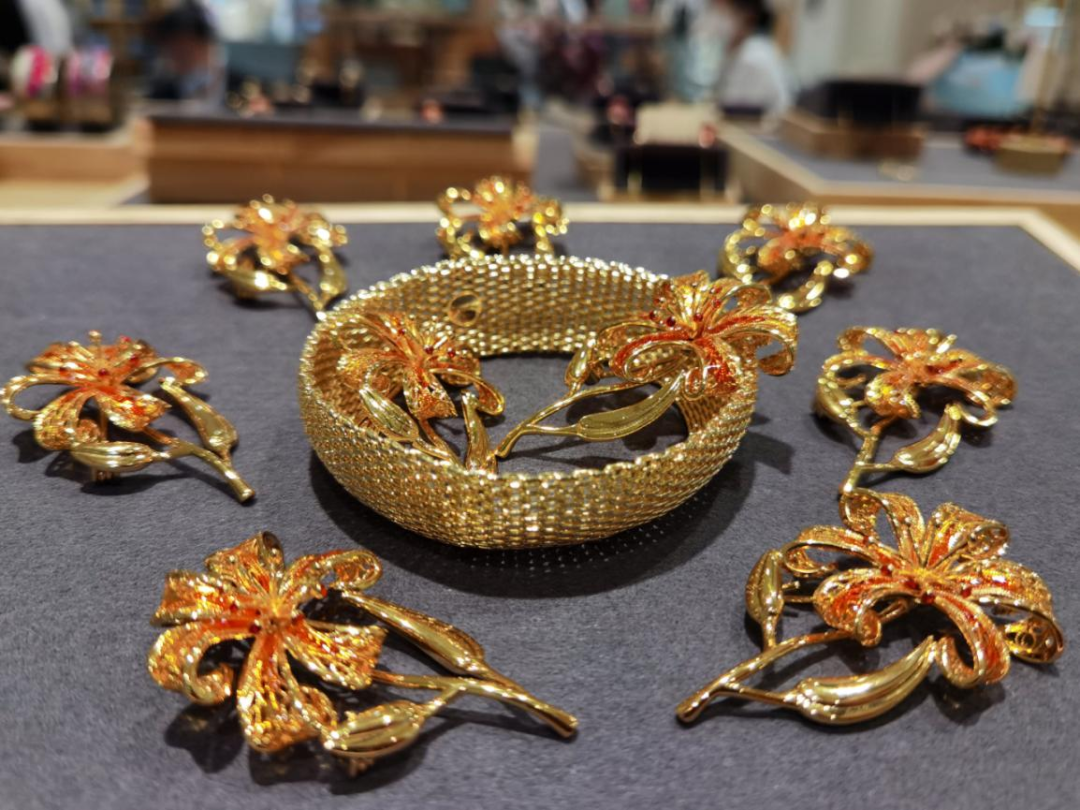 有“金与火的艺术”之称的花丝镶嵌,以花丝为骨、镶嵌做饰,以其独有的魅力展示着中国传统手工工艺的最高境界和艺术价值。馆内展示着融今文化研发的经典产品,即以母爱为产品灵魂的“萱草花系列”胸针,母亲对孩子的爱与牵挂,就像花丝镶嵌丝丝入微,温情脉脉,感人至深。