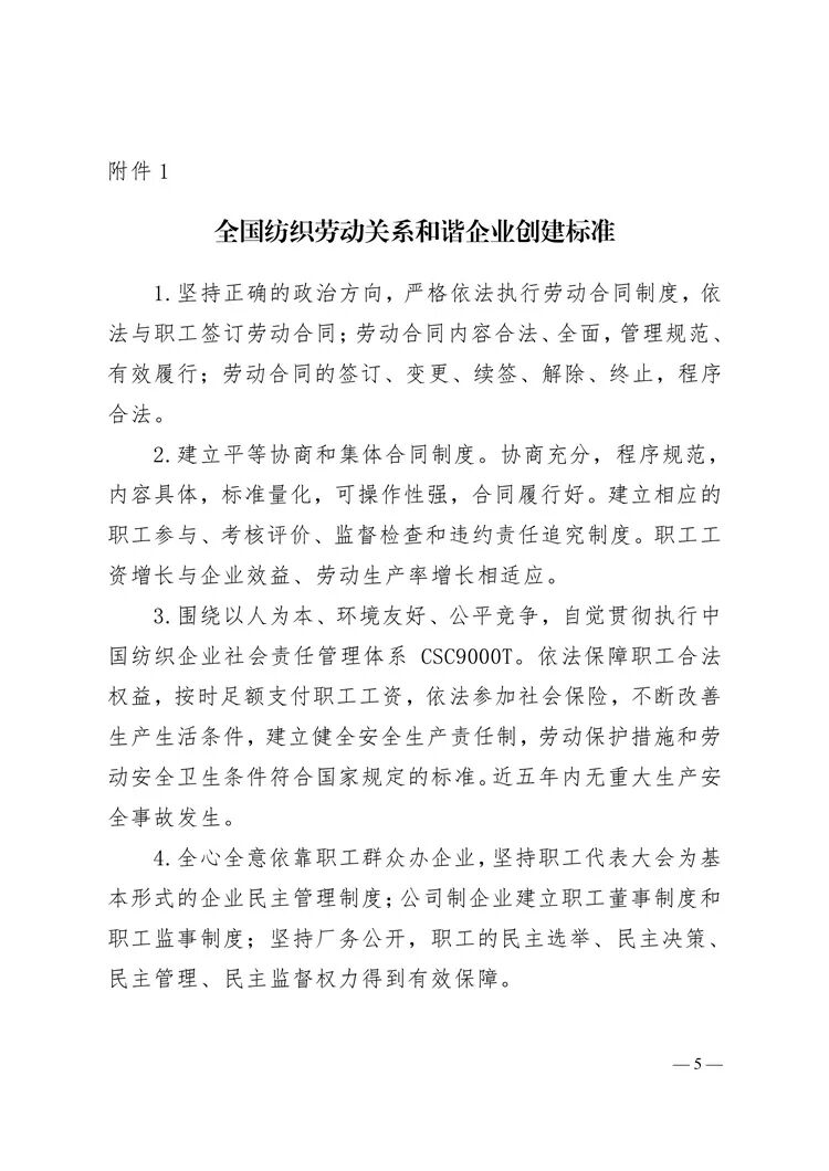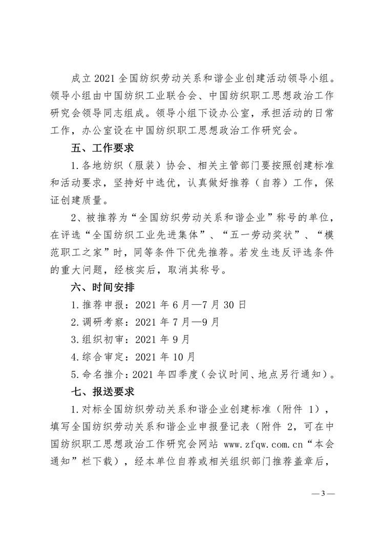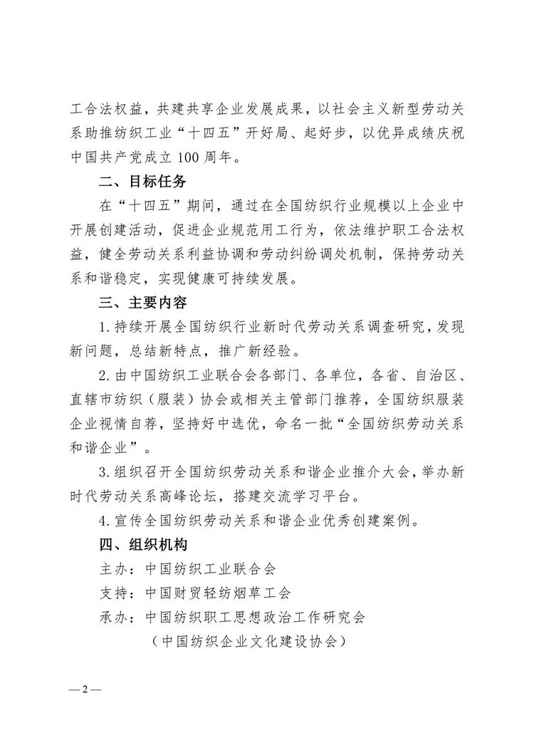 近日,中国纺织工业联合会正式下发了《关于开展创建2021全国纺织劳动关系和谐企业活动的通知》(中国纺联函〔2021〕67号 )。《通知》指出,今年是“十四五”开局之年,为贯彻落实党中央关于深入推进和谐劳动关系创建活动的重要精神,维护企业和职工的合法权益,构建共建共享的和谐劳动关系新格局,推动纺织工业高质量发展,继续开展创建全国纺织劳动关系和谐企业活动。《通知》强调,创建活动以习近平新时代中国特色社会主义思想为指导,坚持新发展理念,以构建和谐稳定的劳动关系为主题,依法保障职工合法权益,共建共享企业发展成果,以社会主义新型劳动关系助推纺织工业“十四五”开好局、起好步,以优异成绩庆祝中国共产党成立100周年。创建活动旨在促进企业规范用工行为,依法维护职工合法权益,健全劳动关系利益协调和劳动纠纷调处机制,保持劳动关系和谐稳定,实现健康可持续发展。《通知》提到,创建活动包括推荐申报、调研考察、组织初审、综合审定、命名推介等五个阶段,将在四季度召开全国纺织劳动关系和谐企业推介大会,举办新时代劳动关系高峰论坛,搭建交流学习平台。《通知》指出,创建活动由中国纺织工业联合会主办,中国纺织职工思想政治工作研究会承办,成立2021全国纺织劳动关系和谐企业创建活动领导小组。领导小组下设办公室,承担活动的日常工作。全国纺织服装企业事单位可对标“全国纺织劳动关系和谐企业”创建标准,由中国纺织工业联合会各部门、各单位或各省、自治区、直辖市纺织(服装)协会及有关纺织主管部门推荐申报,也可视情况自荐申报。申报截止日期为2021年7月30日。