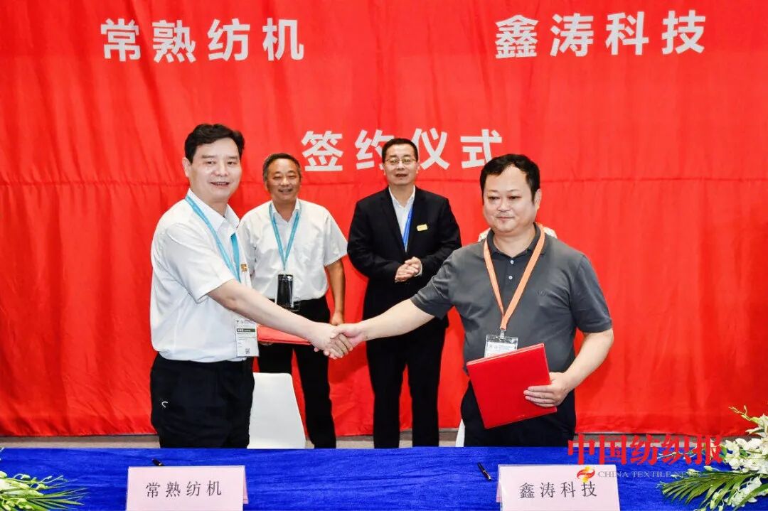 常熟纺织机械厂有限公司在其展位与浙江鑫涛科技股份有限公司现场签约,本次签约后,鑫涛科技共购入常熟纺机168台提花机。