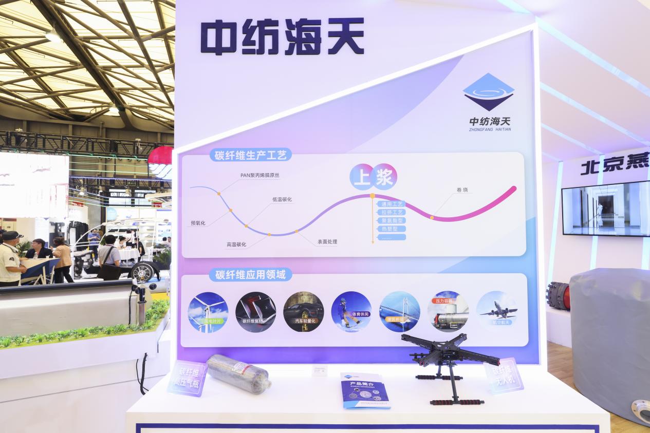 在海天高性能纺织纤维助剂展台,以无人机模型、高压碳纤维气瓶等终端产品的方式生动展示了助剂和碳纤维复合材料的应用,凸显了其在新材料强度、模量、密度、刚度、重量、疲劳等方面研发应用的优势特性。目前,公司研发、生产条件成熟,相关产品品质在国内具有先进水平,上浆剂份额在国内市场处于领先地位。