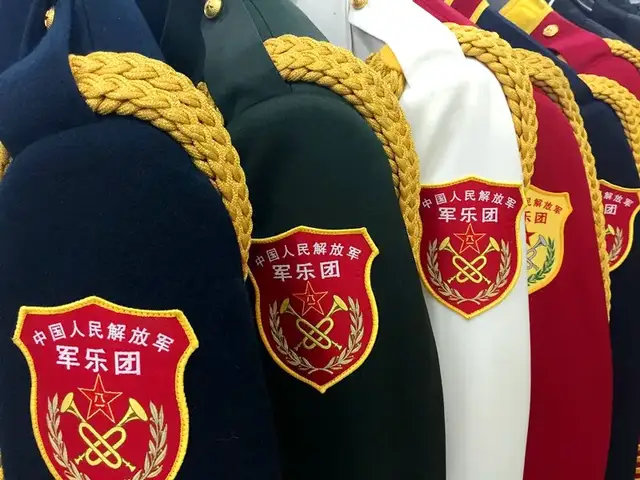 军乐团演奏服最大的特点就是它显眼的绣花,金色的图案鲜艳夺目,威严庄重。为了达到立体、光滑、有光泽的绣花效果,专门从国外定制了绣花用的金线,而且绣花过程中不能断线接线。特别是满绣的款式,操作难度更大,操作工需要时刻观察绣花的进程,仅一件衣服领袖的绣花时间就多达几个小时。