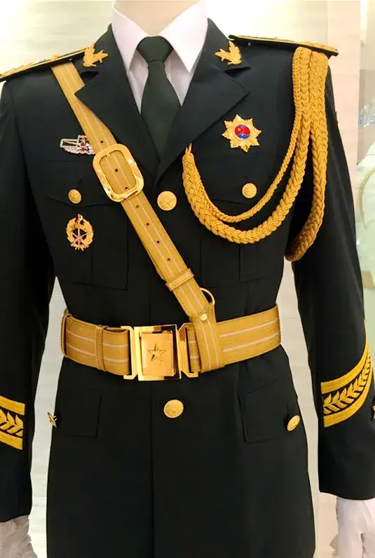 仪仗队队伍身着新式礼宾服,迈着坚定的步伐出场。他们身上的新式礼宾服由江苏阳光集团设计制作。