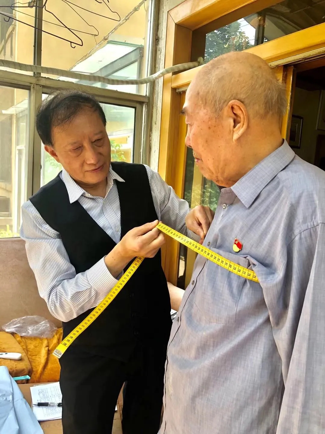 6月29日,“七一勋章”首次颁授仪式在人民大会堂隆重举行。这是党和国家对在中国革命、建设、改革中作出杰出贡献、建立卓越功勋者的高度赞誉。际华3502公司很荣幸地为其中的王占山、郭瑞祥两位老人量身定制了授勋服装。6月初,际华3502公司接到任务,高标准为重要人物量身定制服装。公司立即派出两位“首席”级量体师,在有关人员的导引下,分赴两家干休所进行量体服务。量体师田景春见到王占山老人时,他正接受央媒采访。得知老人是战功赫赫的百战老兵,4次受到毛主席亲切接见,荣获志愿军“二级战斗英雄”荣誉称号,被朝鲜授予“一级国旗勋章”,离休后仍情系国防,倾心传播红色革命基因等事迹后,田景春对老人更加崇敬。他根据老人的身体特点,倾尽自己的量体经验,认真度量,精心计算,准确判定每一个量体数据。量体师郭军涛见到101岁的红军战士郭瑞祥老人时,他正卧床休息。站立量体没一会儿,老人就有些疲惫,郭军涛就建议老人休息一下再量。为缓解老人的疲劳,郭军涛和老人谈起河北老家的事,得知家乡发生了巨大变化时,老人非常高兴,表示一定要找机会回去看看。听说做新衣服是授勋时穿,一向生活简朴的郭瑞祥老人说,只要能坚持,一定要走上台去接受勋章。遗憾的是,由于身体原因,老人最终还是坐着轮椅接受了“七一勋章”这一人生中最高礼遇。