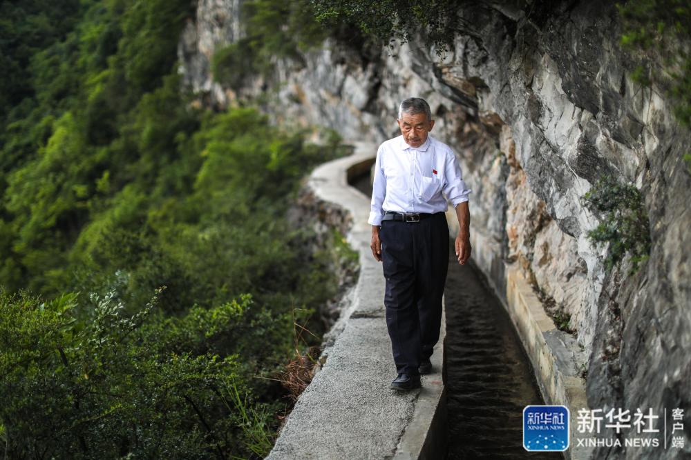 黄大发沿着修建在绝壁上的“大发渠”巡查(2018年8月11日摄)。新华社记者 刘续 摄