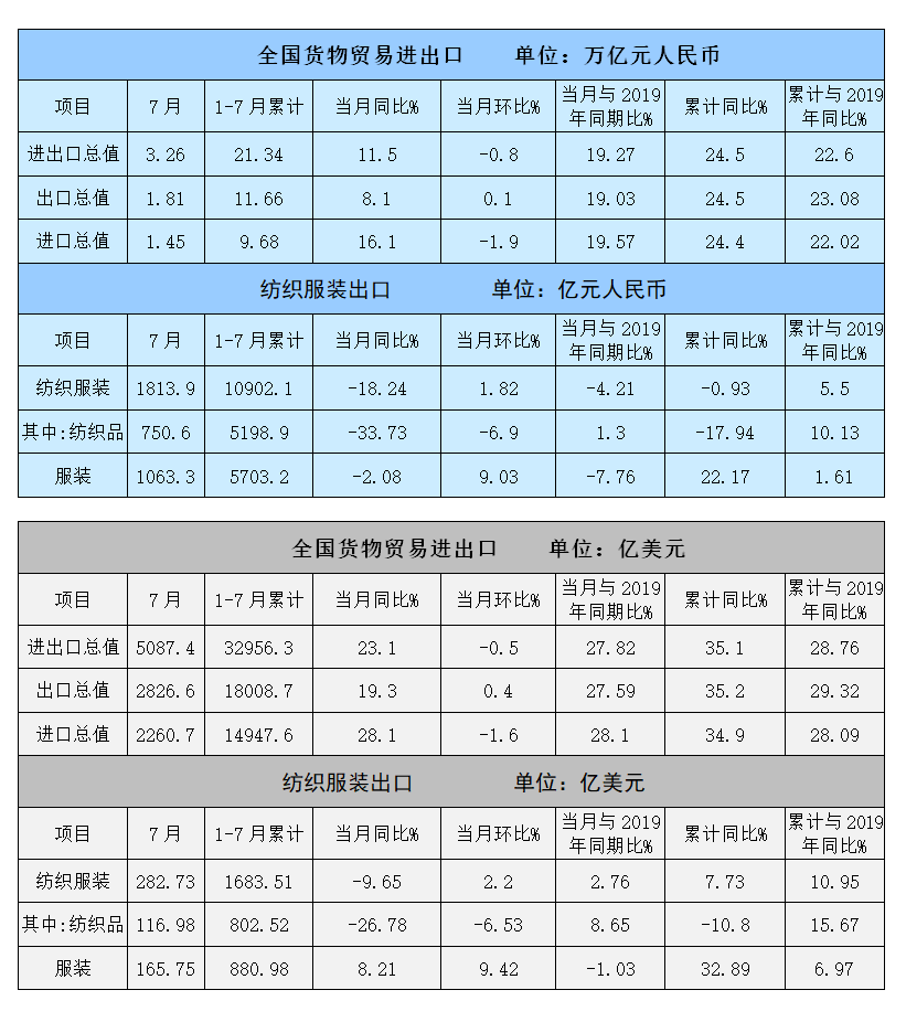 海关总署8月7日发布的数据显示,按美元计,7月,在纺织品影响下,纺织服装出口连续第3月下降,但降幅低于5月;服装出口保持良好增势。1~7月纺织服装累计出口走势稳健,与2020年及2019年同期比均实现增长。