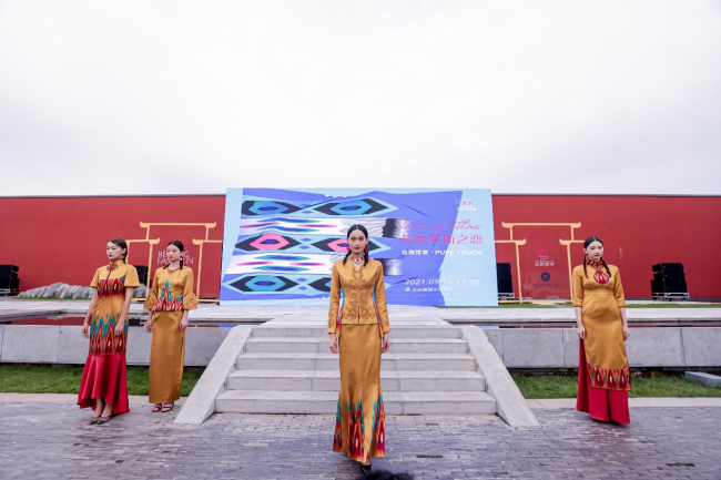 本次发布会由丝路霓裳与PURE TOUCH品牌同台联合发布。 经过前期调研及充分沟通,设计师根据艾德莱斯特性,结合品牌风格,设计开发了艾德莱斯新品系列,也诠释了古老的艾德莱斯在当下多元化的设计传承。