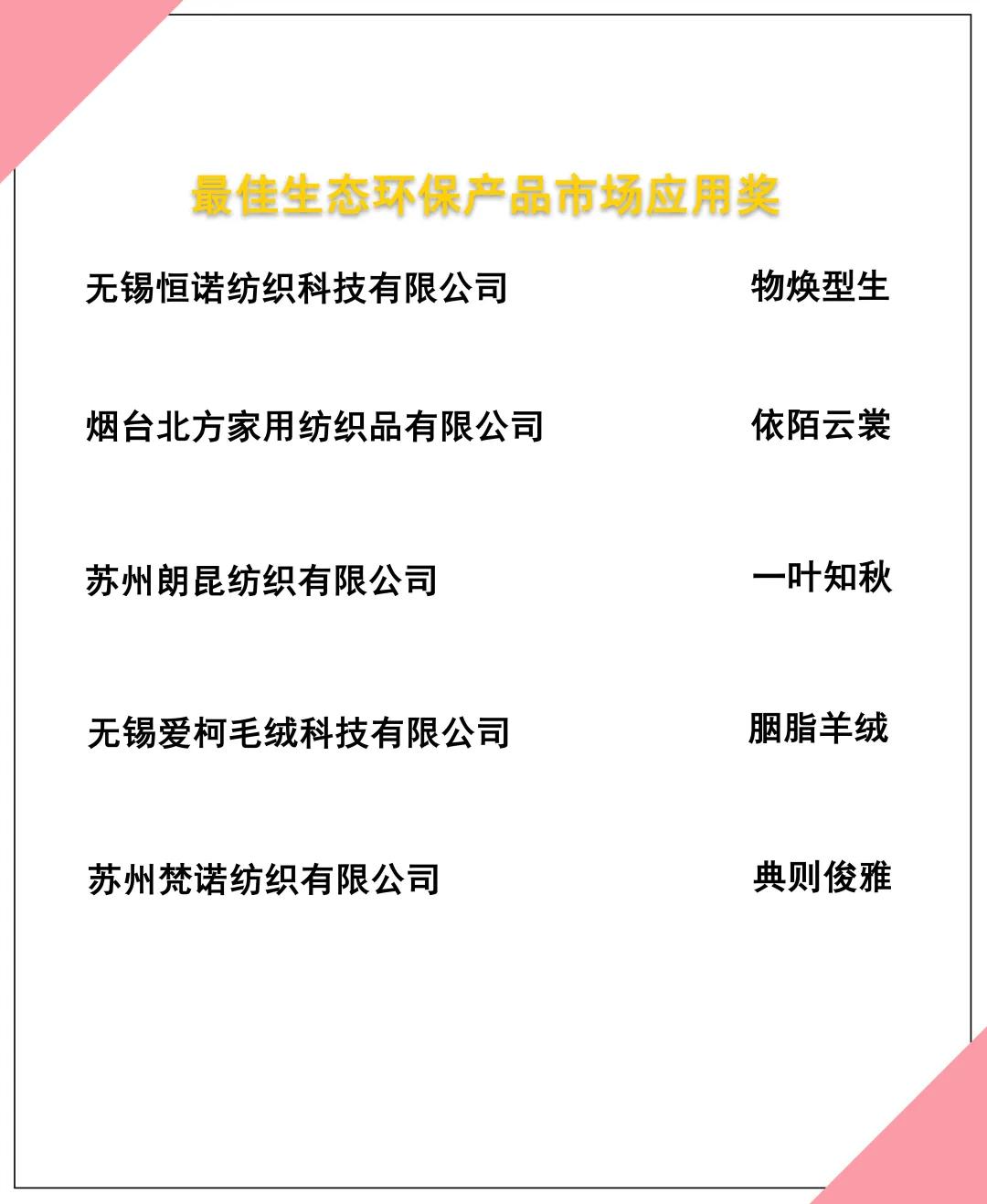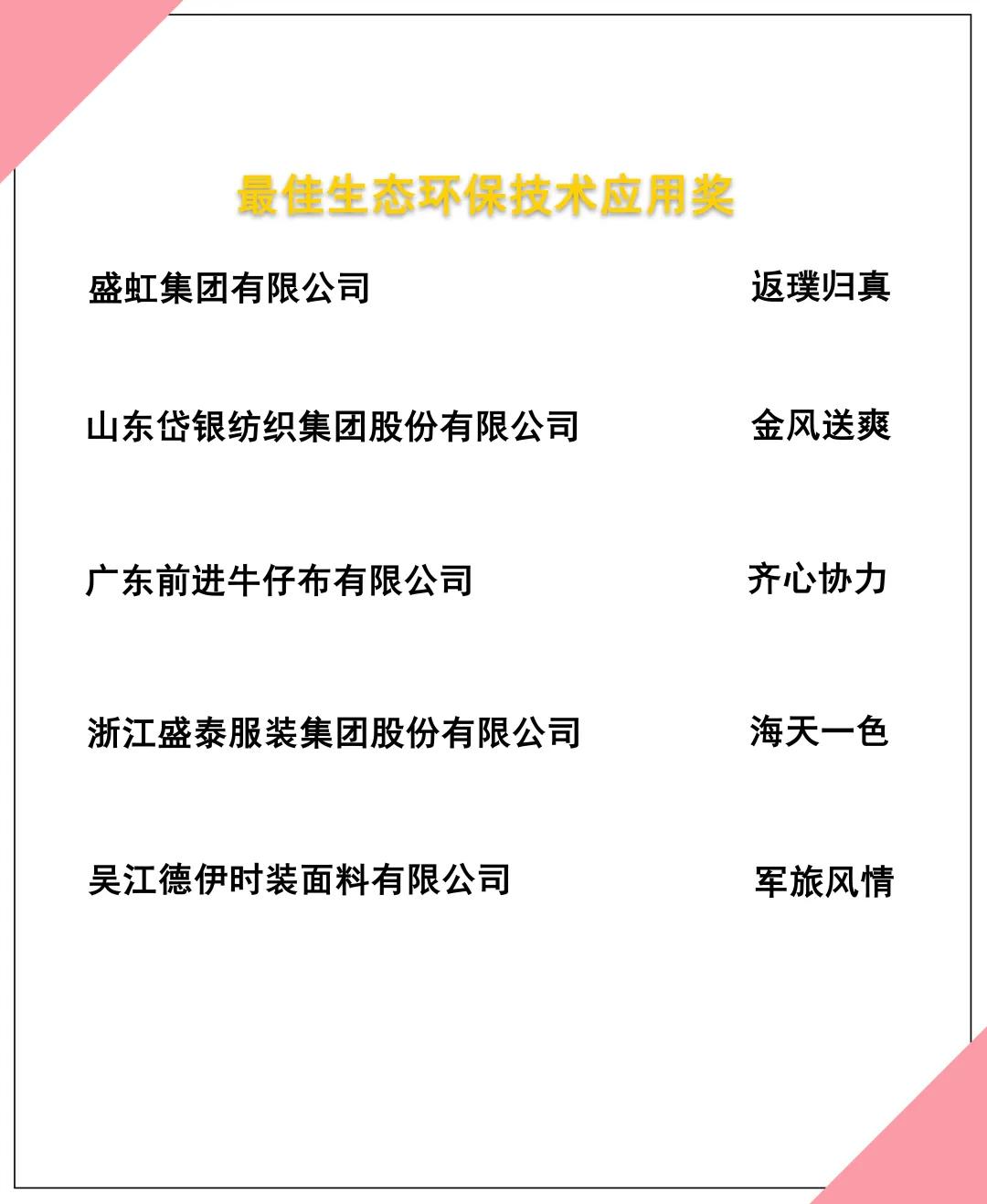 在综合评审专家的评审意见及验证小组的线上验证评价基础上,大赛最终评选出来自115家企业的187款优秀面料,决出“最佳生态环保材料应用奖”、“最佳生态环保技术应用奖”及“最佳生态环保产品市场应用奖”三个单项大奖。
