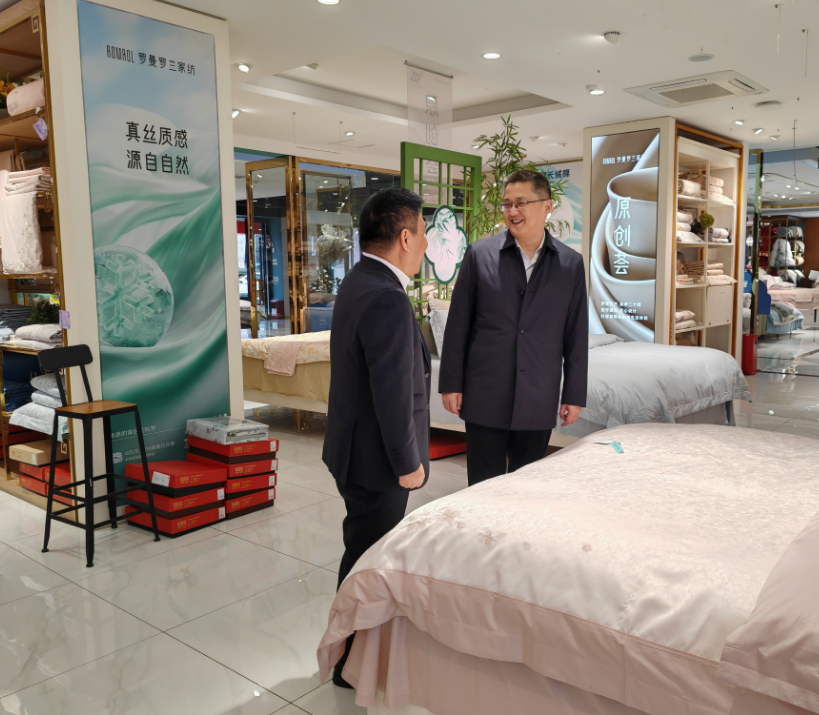 调研组一行首先抵达罗曼罗兰家纺板块,深入了解品牌理念与产品创新实践。徐德荣介绍道,罗曼罗兰家纺始终以“生态家,时尚情”为品牌核心理念,将绿色环保贯穿于产品研发与生产全过程。在坚守生态底色的同时,品牌注重花型与款式的原创设计,致力于打造兼具自然美感与时尚表达的家居产品。