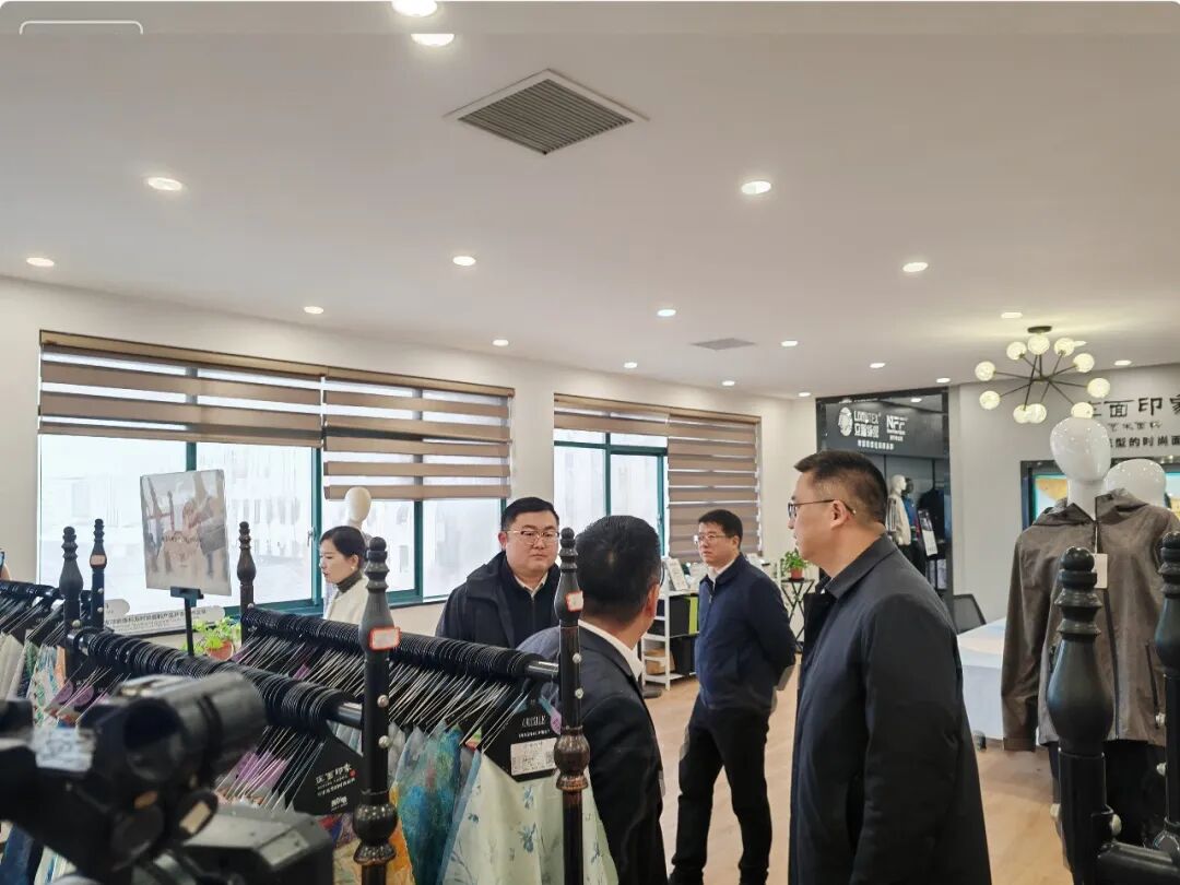 调研最后一站,陈宇一行实地考察庄面印象板块。品牌总监李乾坤围绕企业理念与文化传承展开汇报,首先介绍了品牌传承盛泽五百年丝绸文化的深厚底蕴,并阐述了“专注花型的艺术纺织品”的品牌定位。